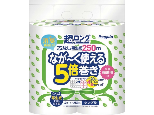 丸富製紙 ペンギン芯なし超ロング再生紙250M4RS 250Mx8